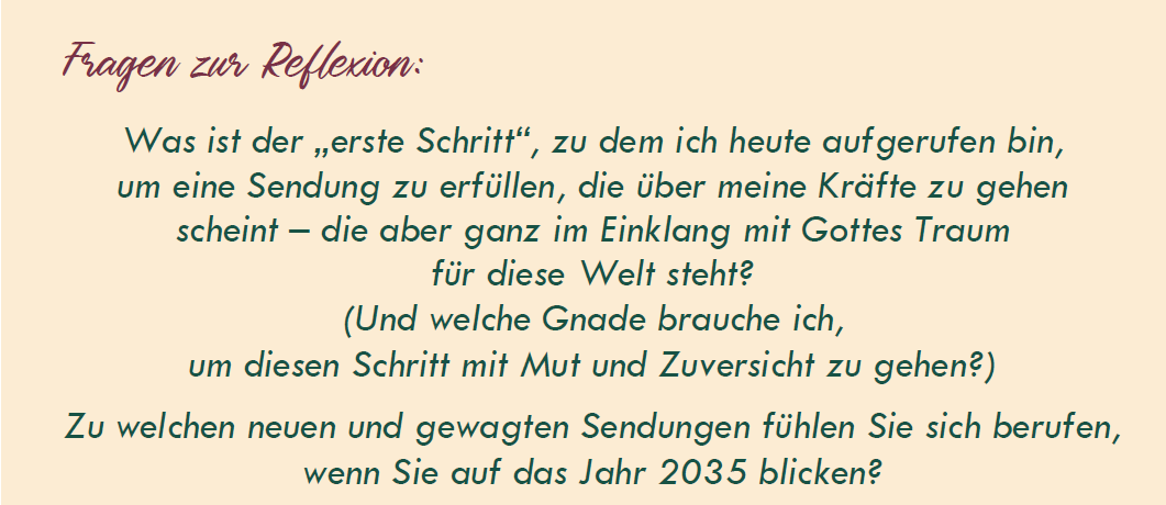 Wie immer laden wir Sie ein, sich in Gruppen zu versammeln, um Ihre Reflexionen auszutauschen – persönlich und online. Und bitte nutzen Sie unser Padlet – fügen Sie Ihre Inspirationen, Gedanken, Kunstwerke, Gedichte, Musikstücke usw. hinzu. Lassen Sie uns mit frohem Herzen unsere gemeinsame Zukunft feiern und uns vorstellen, bereit, dorthin zu gehen, wohin Christus uns ruft, mit Mut und Treue zu unserem Charisma.