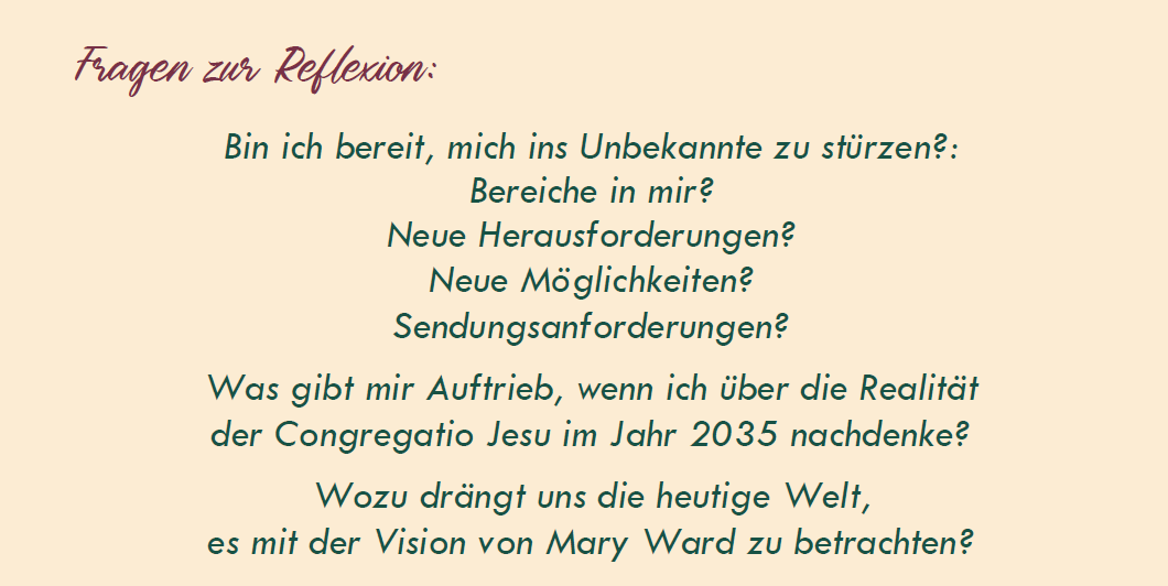 Wie immer laden wir Sie ein, sich in Gruppen zu versammeln, um Ihre Reflexionen auszutauschen – persönlich und online. Und bitte nutzen Sie unser Padlet – fügen Sie Ihre Inspirationen, Gedanken, Kunstwerke, Gedichte, Musikstücke usw. hinzu. Lassen Sie uns mit frohem Herzen unsere gemeinsame Zukunft feiern und uns vorstellen, bereit, dorthin zu gehen, wohin Christus uns ruft, mit Mut und Treue zu unserem Charisma.