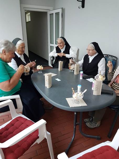 Rundum erneuert, innerlich belebt, im Geiste wach und voller neuer Lebensenergie, ganz und gar glücklich und zufrieden, so durften wir die Mitschwestern an diesem letzten Urlaubsabend im Innenhof erleben in der „Eisdiele des Klosters“.