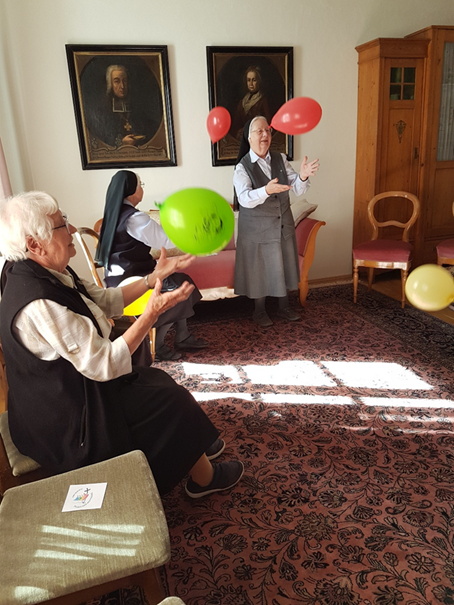 Es war einmal … so fing unser nächster Zeitsprung an und führte uns in die Welt eines Grimm‘schen Märchens „Das Wasser des Lebens“ und zugleich wurden wir alle in den Bann gezogen von der wunderbaren Märchenerzählerin Sr. Barbara Kusche CJ. Sie hatte es geschafft spannend vorzulesen, die Texte mit verschiedenen Klanginstrumenten zu untermalen und uns in unsere Kindheit zu versetzen oder so manche Mitschwestern in ihre damalige Tätigkeit mit den anvertrauten Kindern. Es war einfach herrlich die total konzentrierten Gesichter der Mitschwestern zu sehen. Sie waren in die Märchenwelt eingetaucht. Wunderbar! Mit der Auslegung des Märchens schaffte die Geschichte auch noch den Zeitsprung zurück zu uns selber und sagte uns zu, dass auch wir, jede von uns ein Königskind ist. So kann es weitergehen – mit königlichen Würden nun ausgestattet!