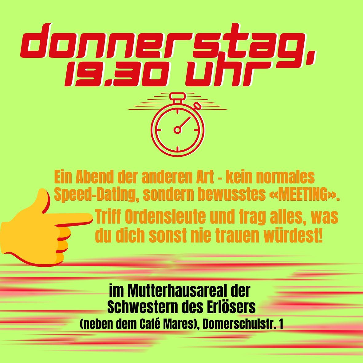 19:30 bis 20:30 Uhr: Speeddating mit Ordensbrüdern und -schwestern: Triff Ordensleute und frag alles, was du dich sonst nie trauen würdest.  Ort: Mutterhausareal der Schwestern des Erlösers, Gebäude Nord, EG (neben dem Café Mares), Domerschulstr. 1